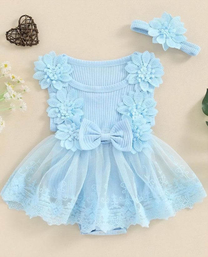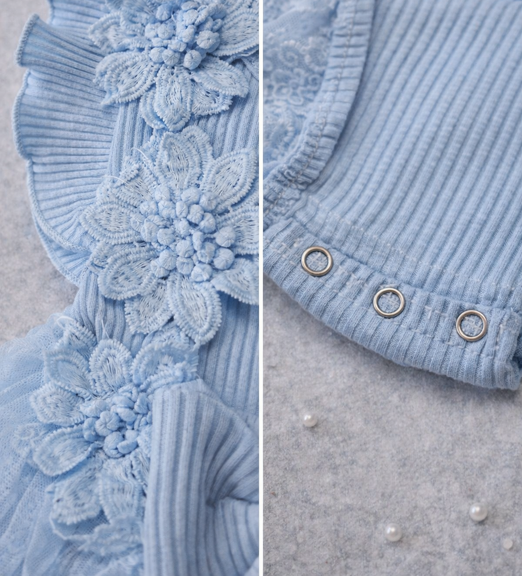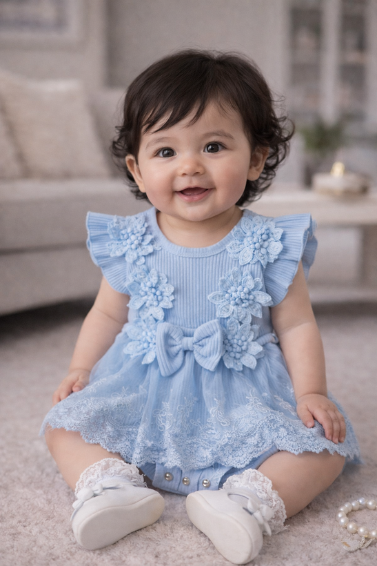بادی مجلسی فوق العاده شیک و مد روز دخترانه آبی گلدار توری با آستر بسیار نرم و لطیف و مهربان با کودک دلبندتان
